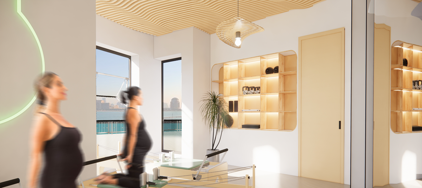 The presence of plants throughout the gym studio not only adds aesthetic appeal but also contributes to a sense of natural calmness This is especially beneficial for expectant mothers, as it helps create a nurturing and healthy environment for their workouts.